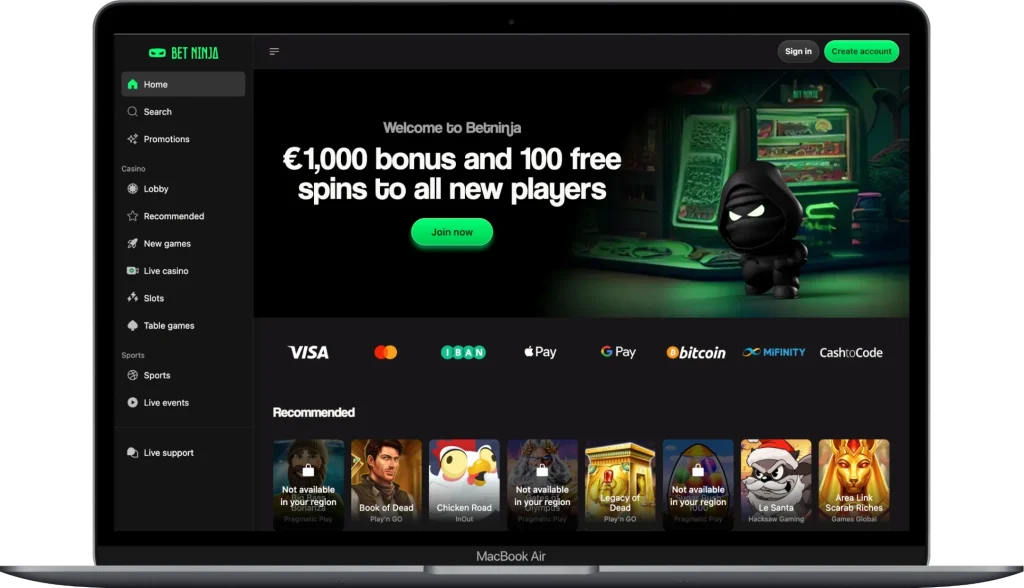 The welcome offer can reach up to €1,000 plus free spins, making it appealing for first time deposits. Payment support is strong, with crypto, credit cards and e wallets all available. BetNinja is popular with players who prefer simple navigation and clean visuals rather than overly busy layouts.